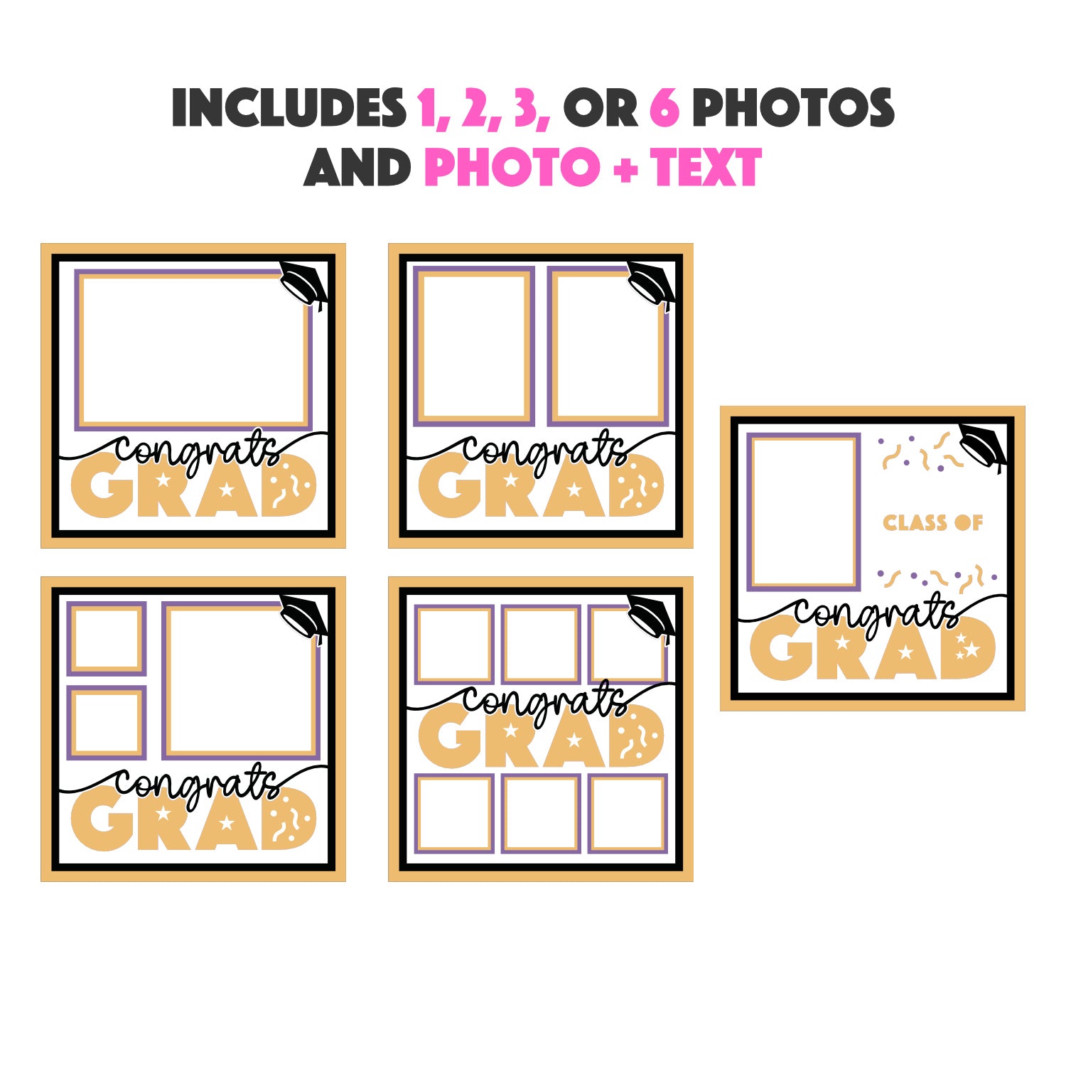 Choose from 1, 2, 3, or 6 photo layouts or add your customizable text to the photo + text layout to make your project uniquely yours.